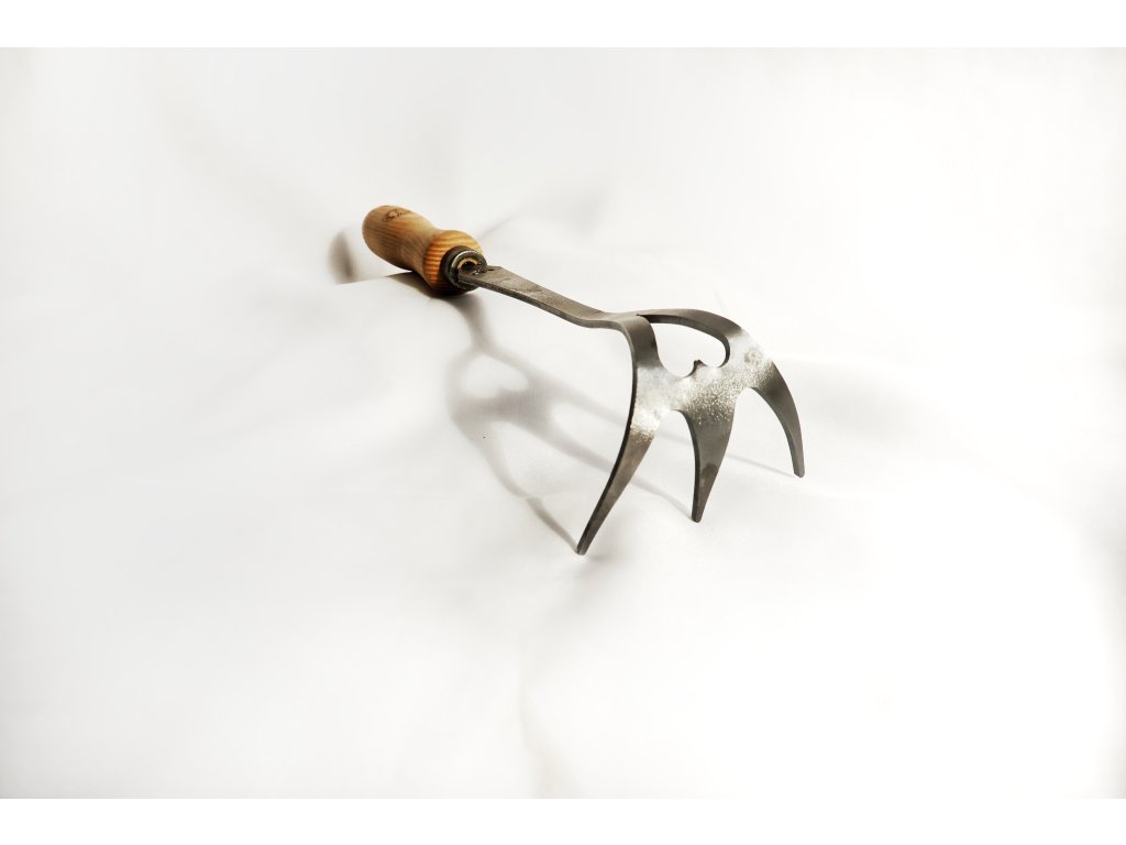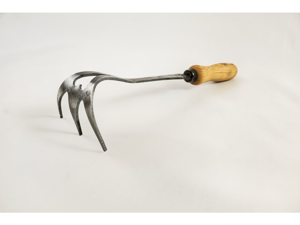 Ručný kultivátor s troma hrotmi vhodný pre prácu na záhonoch a v sklenníku - vyrobený z pevnej ušľachtilej ocele s násadou z jaseňového dreva ošetreného
