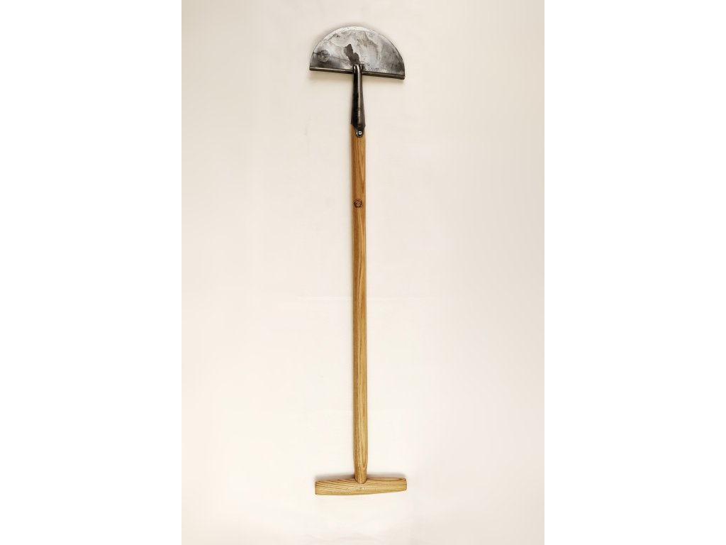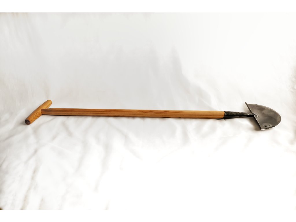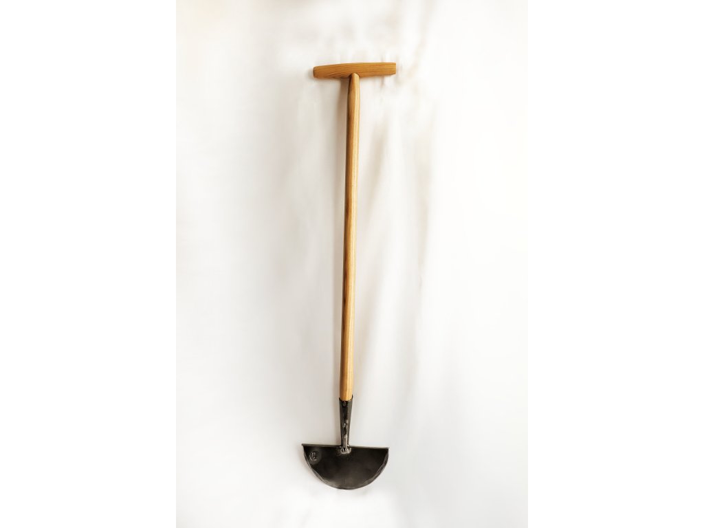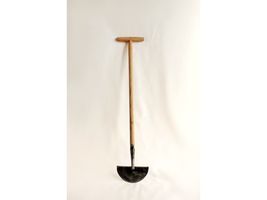 Ľahký , ostrý lemovač trávnikov s ručne kovaným a brúsením ostrím s pevnou T - rukoväťou z jaseňového dreva napustenou ľanovým olejom .