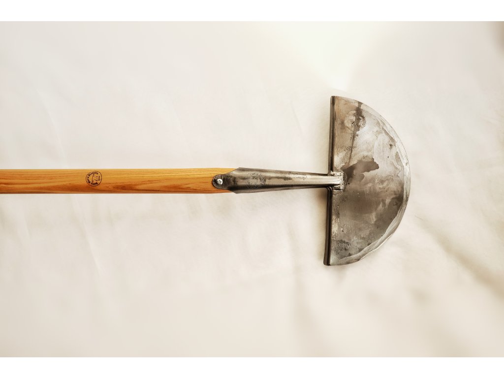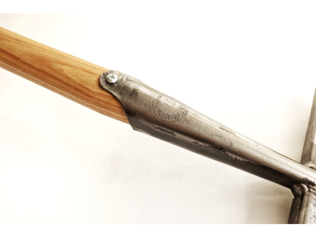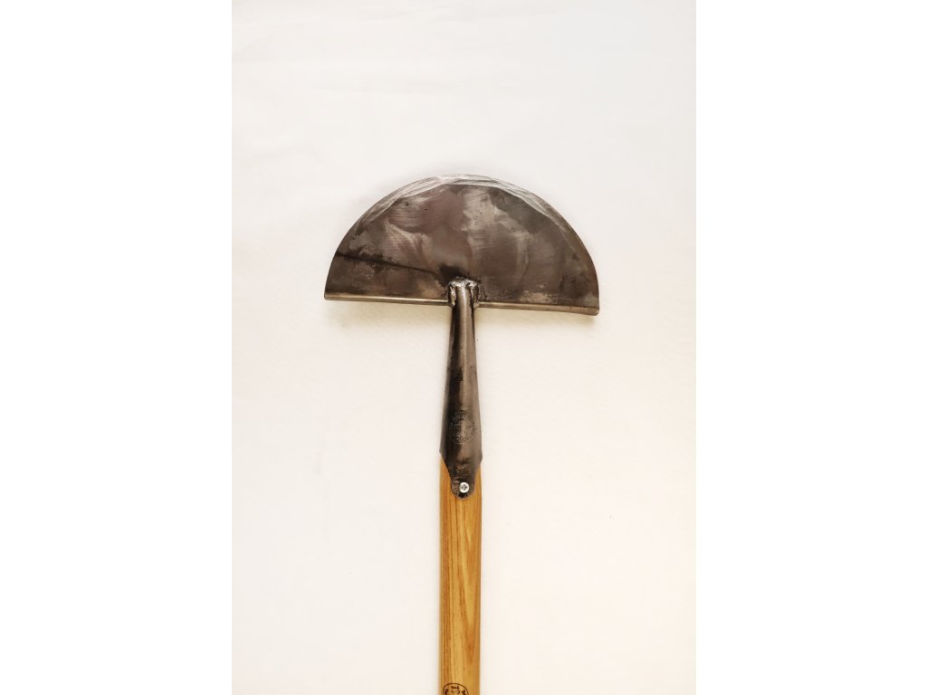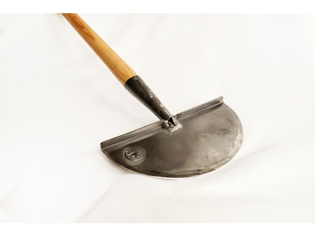 Ľahký , ostrý lemovač trávnikov s ručne kovaným a brúsením ostrím s pevnou T - rukoväťou z jaseňového dreva napustenou ľanovým olejom .